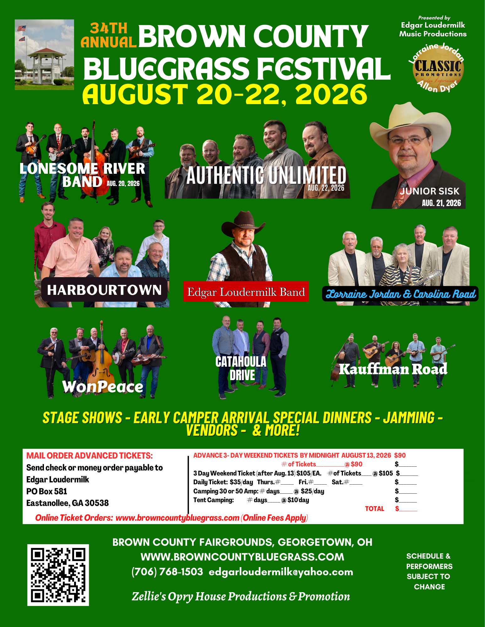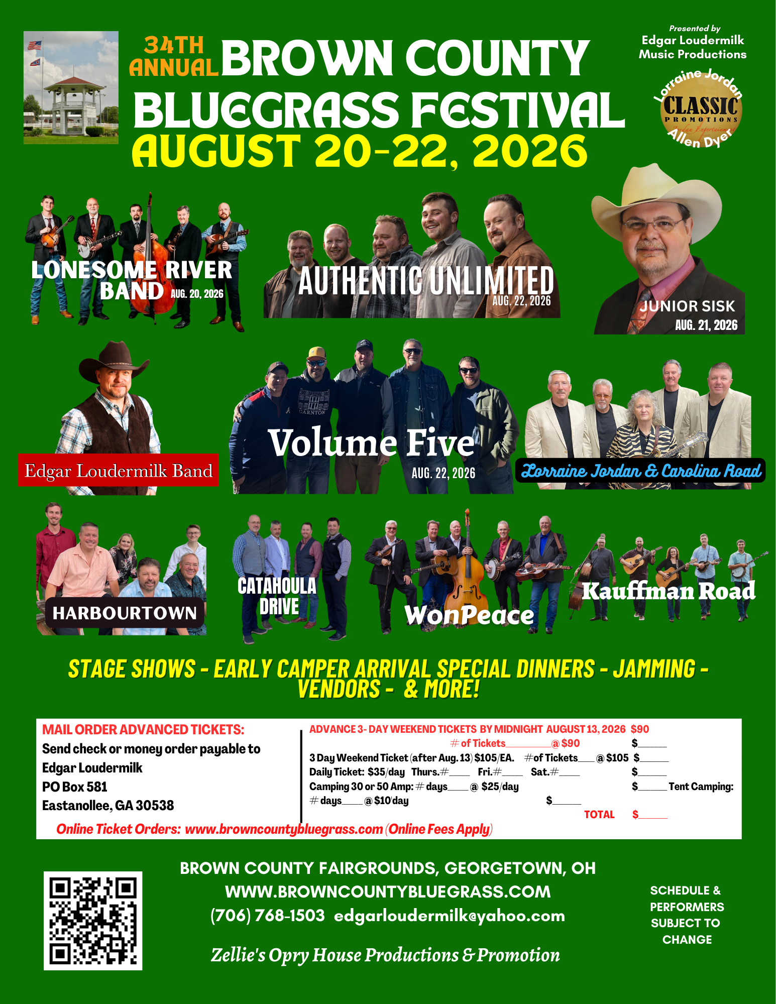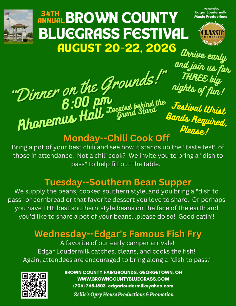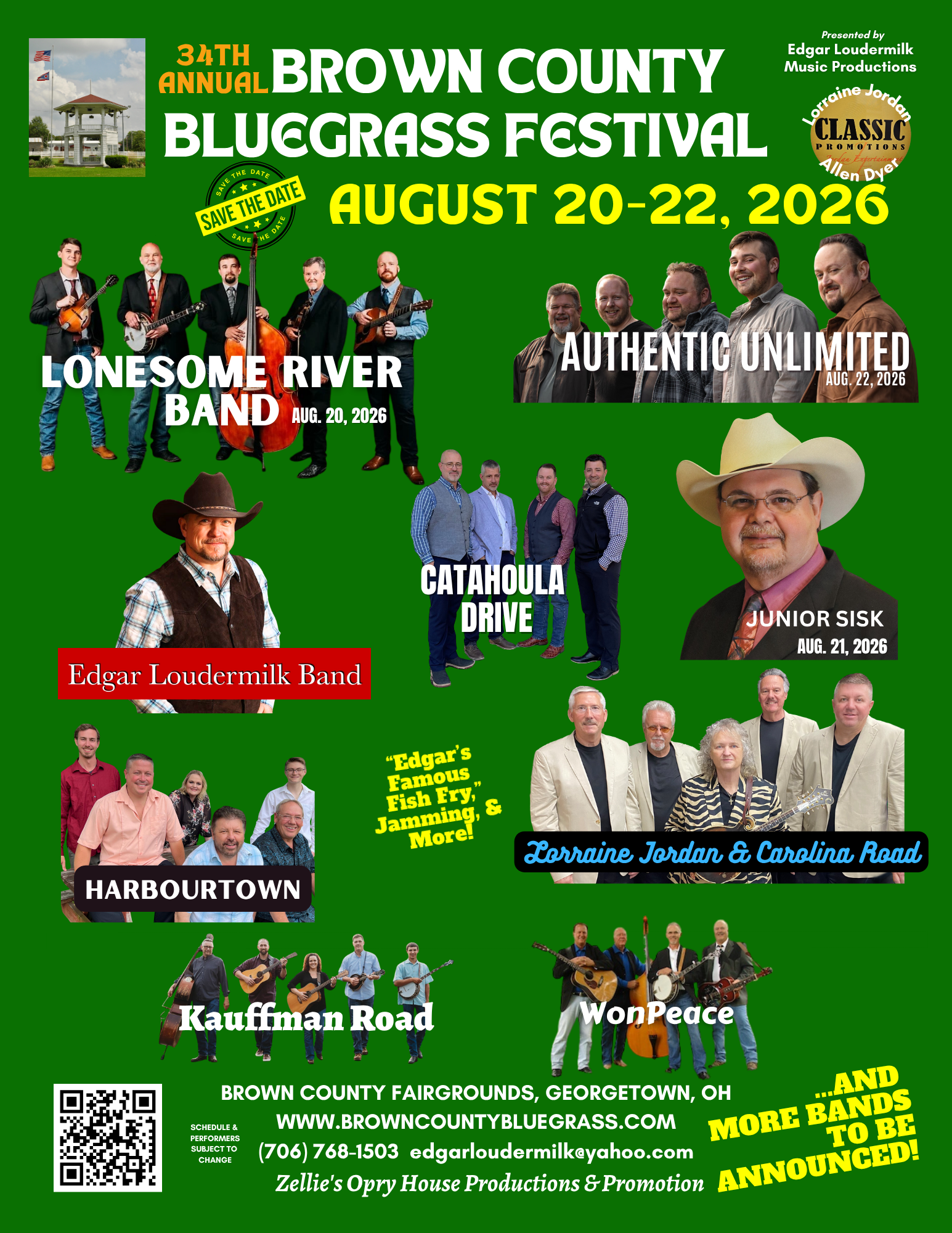 The Brown County Bluegrass Festival in Georgetown, Ohio, is delighted to welcome some of the “best in the bluegrass biz” to the stage at the Brown County Fairgrounds!
